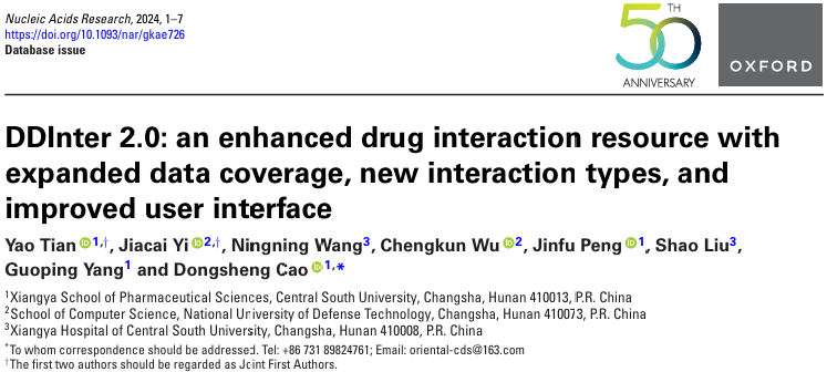 近日,taptap,taptap官方网站,taptap登录入口曹东升教授团队在国际权威期刊《Nucleic Acids Research》(IF=16.6)发表了题为“DDInter 2.0: an enhanced drug interaction resource with expanded data…