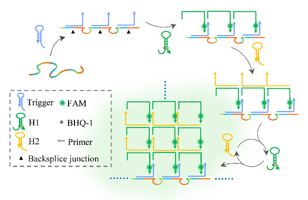 近期,taptap官方网站药剂学系朱曲波副教授团队在生化分析及传感领域的Top期刊《Biosensors and Bioelectronics》(IF=10.618)上发表一篇题为“Specific and sensitive detection of circRNA based on netlike hybridization chain reaction”的研究论文。该研究开发了一种基于网状杂交链式反应的新型环状RNA(circRNA)检测方法。
