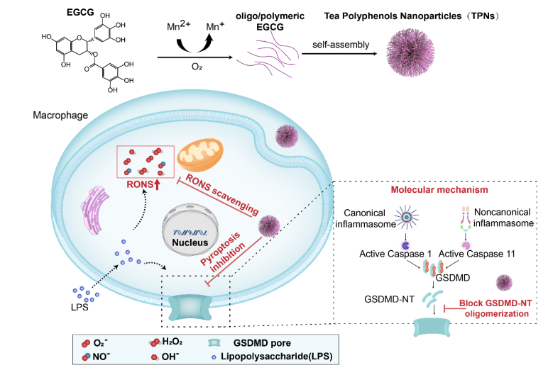 近日,taptap,taptap官方网站,taptap登录入口周文虎教授与湘雅三医院吕奔-赵锴教授团队合作,在纳米材料学领域权威期刊《ACS Nano》(IF=15.881, NI指数期刊)上发表了题为“Intrinsic Radical Species Scavenging Activities of Tea Polyphenols Nanoparticles Blocks Pyroptosis in Endotoxin-Induced Sepsis”的最新原创性研究成果。该研究利用金属离子催化下的表没食子儿茶素没食子酸酯(Epigallocatechin gallate, EGCG)氧化自聚,构建一种新型多功能纳米材料。该纳米材料可通过清除活性氮氧自由基和抗细胞焦亡两条途径,实现对脓毒症的治疗。