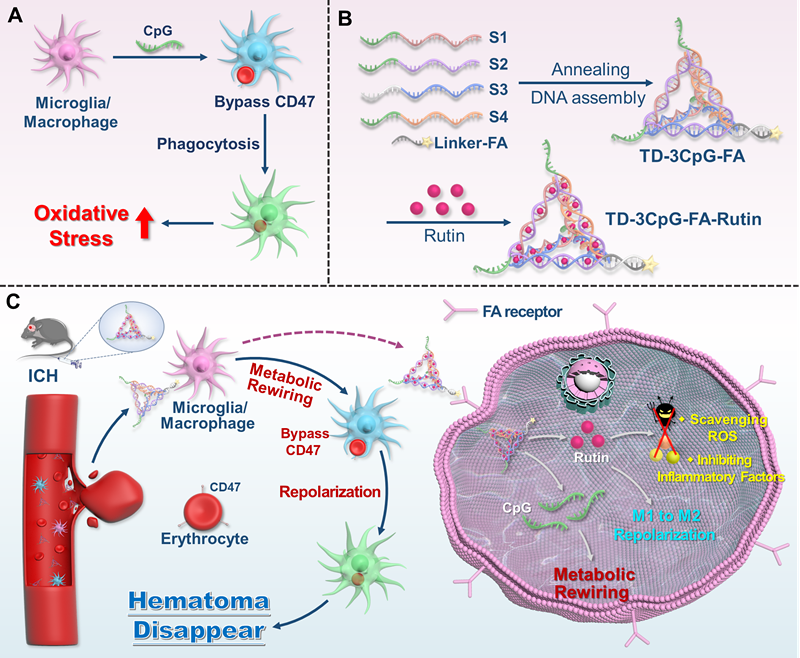 脑出血(ICH)因其高死亡率和致残率而面临巨大挑战,主要归因于脑血肿的形成和随后的神经炎症。迅速清除血肿对预后至关重要,但现有的治疗尚不完善。因此,探索ICH疾病进展中的关键靶标并进行特异性干预具有重要意义。值得注意的是,血肿相关红细胞CD47表达升高会触发“不要吃我”信号,阻碍血肿清除。团队前期研究表明,CpG通过调节代谢增强小胶质细胞/巨噬细胞对表达CD47的红细胞的吞噬作用,但是单独使用CpG治疗有一定的局限性,如小胶质细胞/巨噬细胞吞噬红细胞会加剧氧化应激,并引发神经炎症。为此,本研究以DNA四面体(TD)作为载体,构建共递送CpG与芦丁(具有抗炎和抗氧化作用的类黄酮小分子化合物)的DNA递送系统(命名为TD-CFR),用于脑出血治疗。CpG与TD的结合保留了其促吞噬作用,而TD的双链区能够有效装载芦丁。由于出血部位血脑屏障完整性的破坏,TD-CFR经静脉给药后可有效富集与脑部,并在叶酸受体介导下靶向小胶质细胞/巨噬细胞。在体内外模型中,TD-CFR均显示出对ICH的良好干预效果及生物安全性。