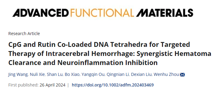 近日,taptap,taptap官方网站,taptap登录入口周文虎教授团队与taptap官方网站湘雅医院肖波教授团队合作,在Advanced Functional Materials(中科院1区Top期刊,IF=19)杂志上以Research Article形式发表题为“CpG and Rutin Co-Loaded DNA Tetrahedra for Targeted Therapy of Intracerebral Hemorrhage: Synergistic Hematoma Clearance and Neuroinflammation Inhibition(共载CpG和芦丁的DNA四面体靶向治疗脑出血:协同清除血肿和抑制神经炎症)”的原创研究论文。