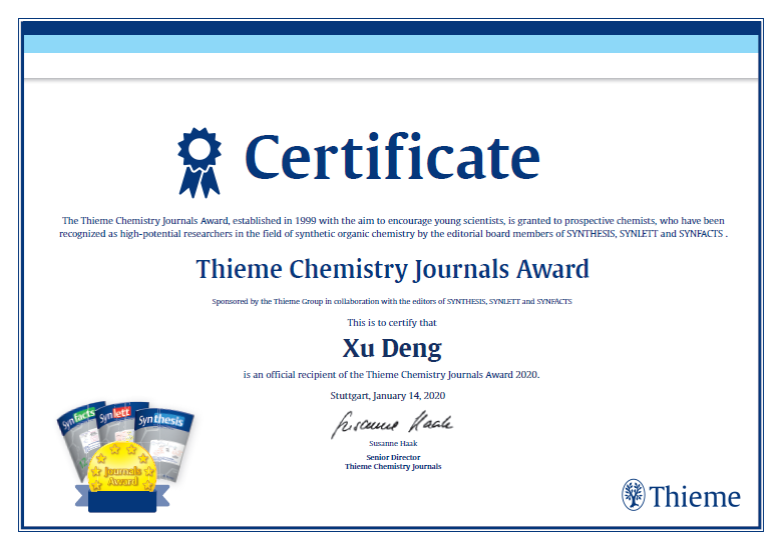 近日,taptap官方网站taptap官方网站邓旭副教授荣获2020年度“Thieme Chemistry Journal Award”国际学术奖。该奖项是由德国Thieme Group(德国蒂莫出版集团)于1999年首次设立,每年颁发一次,由德国Thieme出版集团三大著名化学期刊Synthesis, Synlett和Synfact编委会在全球范围内遴选,旨在表彰和鼓励处于独立学术研究生涯早期,在有机合成与催化领域崭露头角的青年学者。