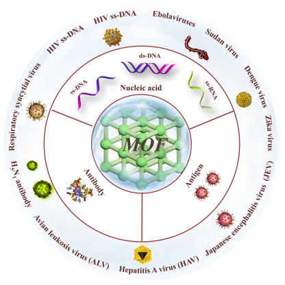 病毒的爆发对人类的生命健康、社会经济的发展等产生了巨大的影响。病毒的及时检测对于预防和治疗相关疾病至关重要。金属有机骨架(MOF)是一种新型杂化多孔材料,它主要由金属簇和有机配体桥连而成。其显著的优点:如高比表面积、可调节的孔径、易于修饰和设计的结构等,使其成为具有较好应用潜力的病毒检测平台。但是,基于MOF的病毒检测传感平台却很少有综述报道。该篇综述系统地将基于MOF的病毒检测平台分为核酸和免疫学(包括抗原和抗体)检测。在核酸检测方面,着重阐释了其传感机制,并重点揭示了MOF的传感性能与MOF的性质如金属离子、官能团、几何结构、大小、孔隙率、稳定性等之间的关系;在免疫检测方面,主要突出了基于荧光传感技术的抗体检测和基于分子印迹或电化学免疫分析技术的抗原检测。最后,进一步讨论了MOF在病毒检测上的发展方向。这篇综述将为构建用于检测病毒特别是2019新型冠状病毒(SARS-CoV-2)的传感平台提供有价值的参考和思路。