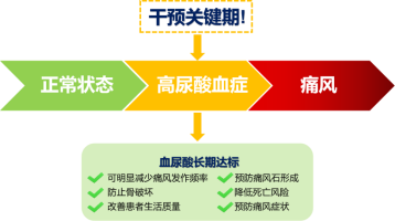 痛风只是高尿酸的冰山一角,正是因为高尿酸没有明显身体不适,因此往往被忽略,容易错过预防痛风的最佳时期;但其危害性是潜在持续的,长期危害性更大。现代大量研究表明,长期高尿酸和痛风可损害肾、心、脑等多个重要脏器,引发高血压、肾损伤、糖尿病、冠心病和脑卒中(中风)等多种重大疾病,严重影响我们的生活质量和寿命。